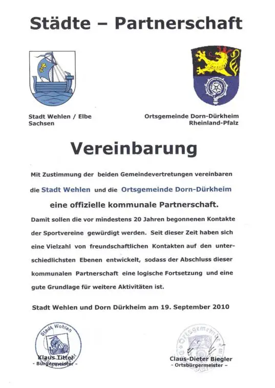 Im Jahre 1989 kam es zur ersten Kontaktaufnahme zwischen aktiven Fußballern des TuS Dorn-Dürkheim mit dem TuS Einheit Wehlen. Der erste Besuch in Dorn-Dürkheim erfolgte 1990 durch Sportfreunde aus Stadt Wehlen und seitdem jährlich im Wechsel. Am 19. September 2010 wurde in Dorn Dürkheim eine Städtepartnerschaft zwischen beiden Orten vereinbart.