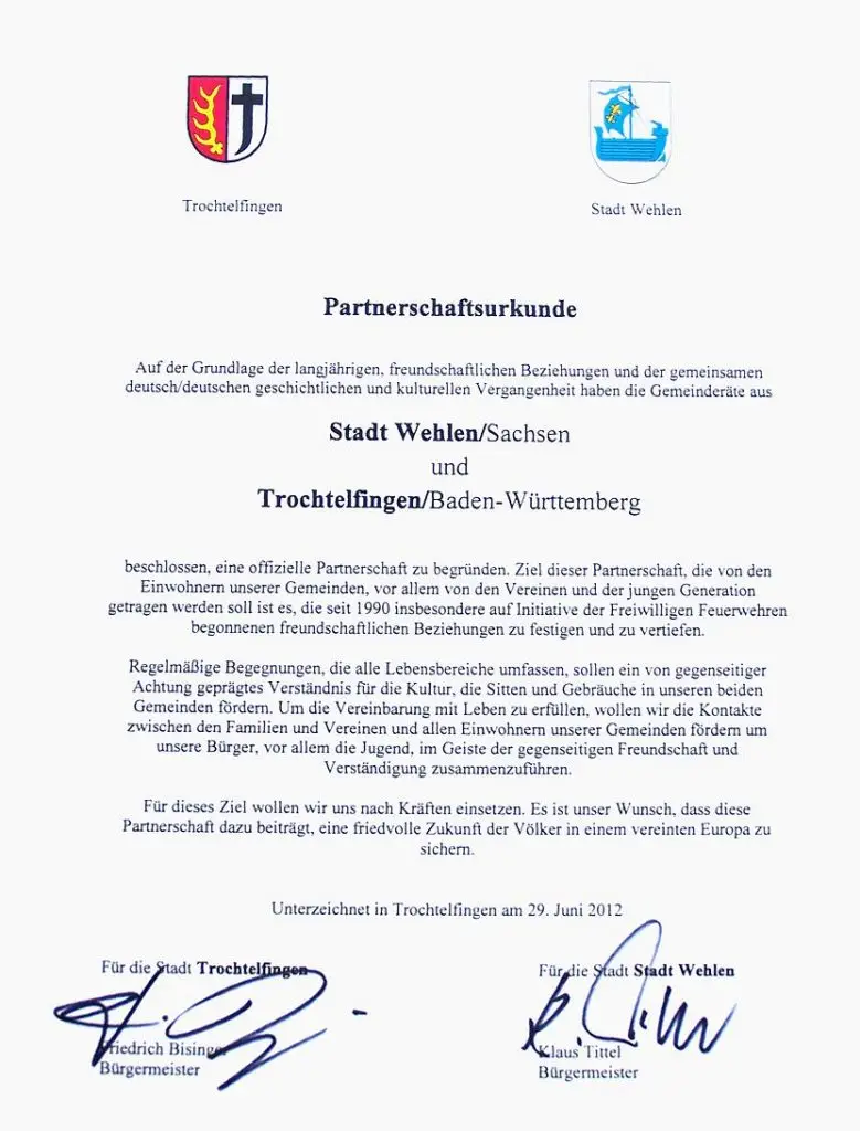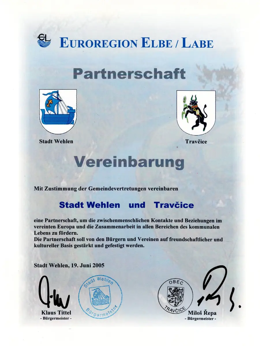 „Mit Zustimmung der Gemeindevertretungen vereinbaren Stadt Wehlen und Travcice eine Partnerschaft, um die zwischenmenschlichen Kontakte und Beziehungen im vereinten Europa in allen Bereichen des kommunalen Lebens zu fördern. Die Partnerschaft soll von den Bürgern und Vereinen auf freundschaftlicher und kultureller Basis gestärkt und gefestigt werden.“